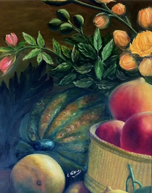 Abóbora e cesta de Pêssegos com Flores
